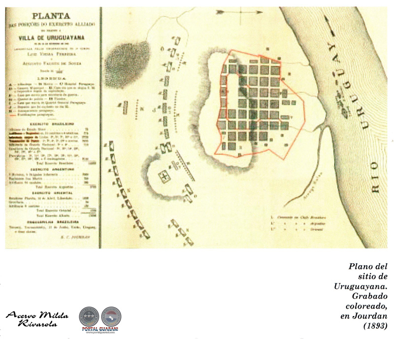 Plano del sitio de Uruguayana. Grabado coloreado, en Jourdan (1893)