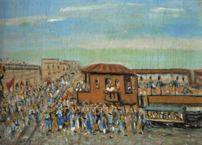 La disposición de las escenas, en efecto, no sigue un sistema cronológico aunque estén concertadas ellas en forma contigua y sucesiva. Uno a uno, los cuadritos aparecen detallados con la fecha en la que transcurriera el suceso pintado y el detalle del mismo. Describo exactamente el orden en que se presentan algunos episodios por sus epígrafes originales: en 1909 Núñez Soler se autorretrata como pintor de brocha gorda y carpintero; en 1916 aparece rasurado y encerrado en un calabozo por haber participado en una huelga. De pronto, la escena se aleja de su persona: en 1922 irrumpe en ella un ataque de la policía montada (se supone que entre los atacados se encuentra el pintor). Ataviado ya con su característico lazo negro llevado como corbata, en 1915 Núñez Soler aparece arengando a una multitud en la plaza Independencia; en 1900 se autorrepresenta como monaguillo y, en otro cuadro contiguo, como albañil. Ahora la mirada retrocede hasta el trasfondo de la memoria: en 1891 (año de su nacimiento) aparece pintado un asalto político a su casa familiar. El siguiente cuadro salta hasta 1913, cuando el artista es mostrado como dependiente de una panadería y luego a 1908, como empleado de una tienda y, después, en 1902: trabajaba entonces en una zapatería. En 1912 Núñez Soler aparece montando guardia durante una revuelta revolucionaria e, inmediatamente, integrando un pelotón civil con sus amigos del barrio, en 1904.