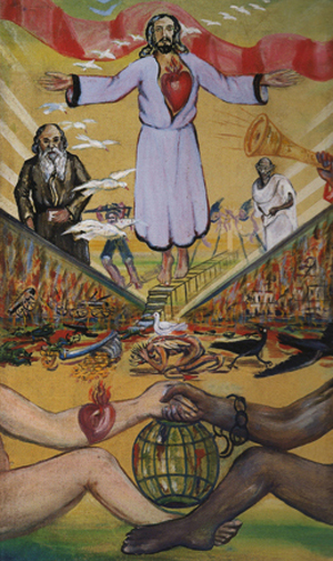 Por último, el artista pinta con una intención `performativa' que es tanto popular como ilustrada. Es decir, mucha obra suya busca actuar sobre los hechos históricos a través de lo representado; funciona entonces con ánimo mágico-propiciatorio: un empeño voluntarista que se enfrenta a lo real desde el reino de la imagen. Por eso, el artista pretende cambiar la sociedad pintando el cambio que tanto anhela y convocando por medio de la figura el advenimiento de un mundo más justo y más humano. Según quedó indicado, a menudo los cuadros de don Ignacio llevan en sus reversos largos textos manuscritos que los explican y los interpretan; que constituyen -literalmente hablando- la otra cara de la pintura y ayudan a ésta a apurar transformaciones. Tal omnipotencia otorgada al símbolo permite que el artista corrija el presente, enmiende los errores de la historia y señale a éste su curso correcto: la emancipación universal y necesaria.