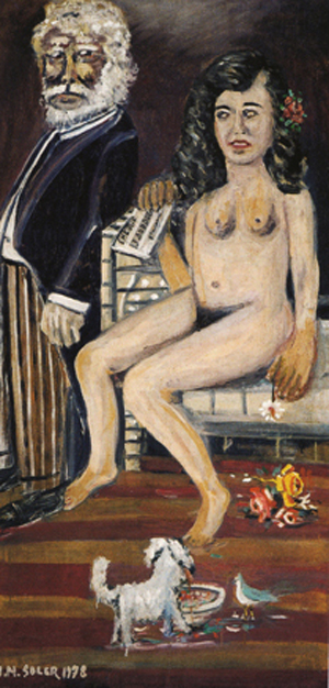A lo largo de las décadas de los años sesentas y setentas, Núñez Soler pintó algunas escenas de desnudos femeninos que constituyen casos particulares de su particular derrotero. Dado que no se adaptan ellos a los grandes ejes de su repertorio temático, y considerando sus notables valores formales y su importancia expresiva, me refiero rápidamente a estos temas singulares. Básicamente, los mismos se encuentran representados a través de pinturas que denuncian situaciones vejatorias a la dignidad humana o encarnan el ideal de belleza corporal que el pintor profesa. En unos casos, las protagonistas se muestran involucradas en climas sórdidos: encarceladas por sus creencias o corrompidas por su ambición, ellas exponen frontalmente sus infortunios, aparecen posando como figuras de prontuario policial y se muestran exhibidas como objetos en un sentido que agravia la condición de la mujer. En otras ocasiones, son sorprendidas en espacios íntimos: baños, tocadores -que justifican su desnudez y resguardan el recogimiento elemental-. Estos connotan, por cierto, despojo y vulnerabilidad. Pero también significan celebración del cuerpo y plenitud de la forma femenina. Y sugieren la afirmación en clave pictórica de la inocencia original.