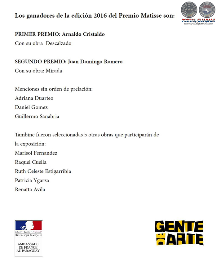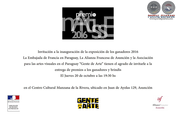 La Embajada de Francia en Paraguay, La Alianza Francesa de Asunción y la Asociación para las artes visuales en el Paraguay “Gente de Arte” tienen el agrado de invitarle a la entrega de premios a los ganadores y brindis el jueves 20 de octubre a las 19:30 hs, en la Manzana de la Rivera (Ayolas, 129, Asunción)