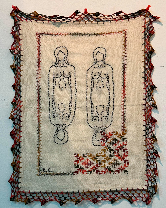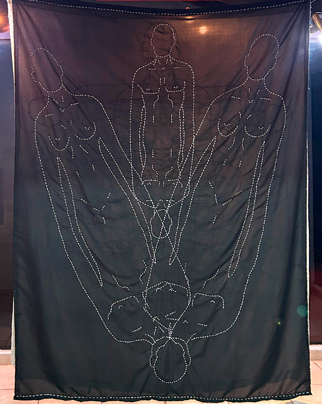 El bordado es rito y es huella. La aguja atraviesa, une, desgarra y recompone. Lo humano se fragmenta y se duplica: somos hilos entretejidos en una vasta trama, cuerpos que insisten en existir, aún en la fragilidad de la tela, aún en la incertidumbre del espacio.