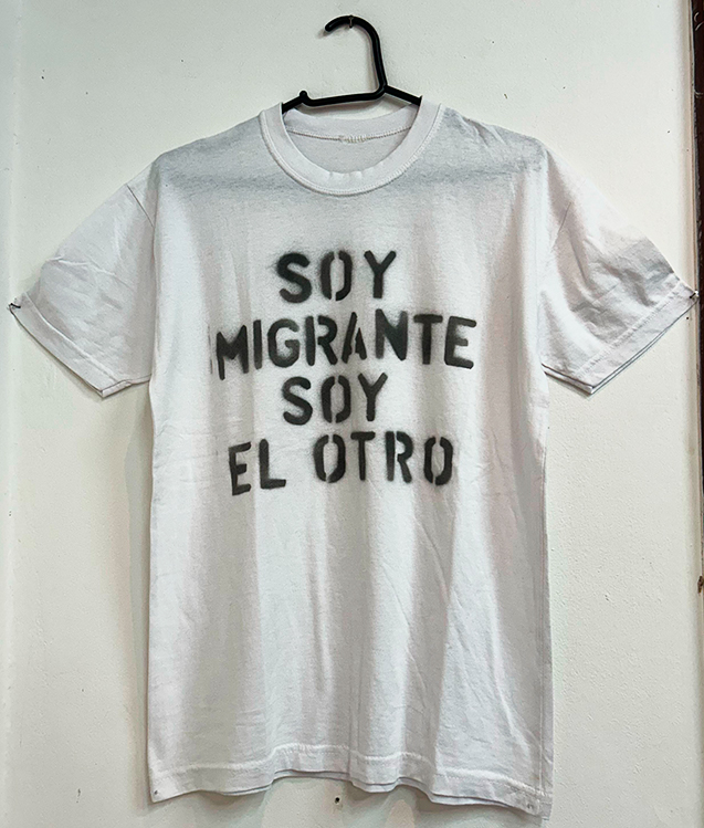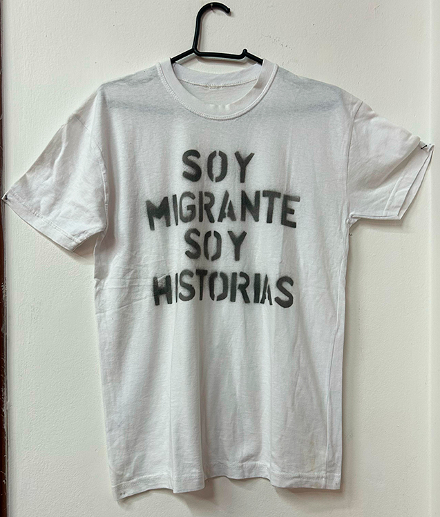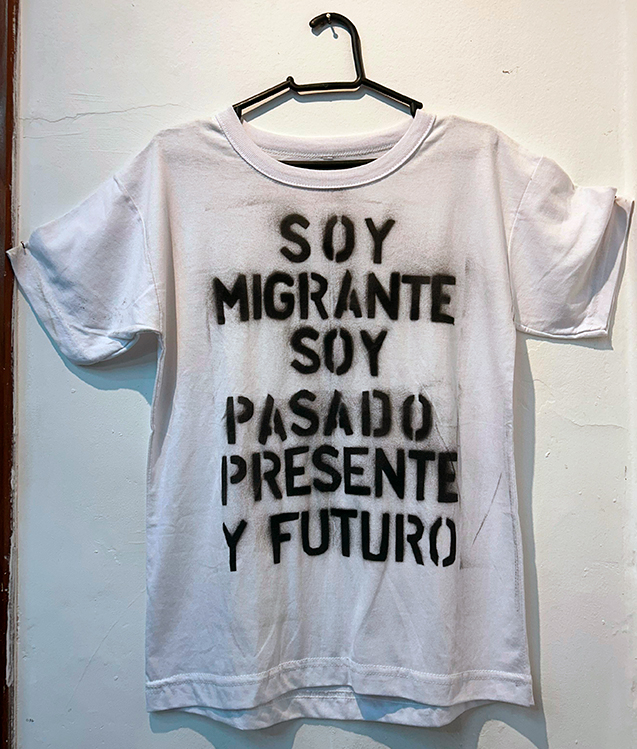 Las palabras estampadas son ecos de voces migrantes, memorias en tránsito que resisten el olvido. Declaraciones de cuerpos que cruzan fronteras afirmando su lugar en el mundo.