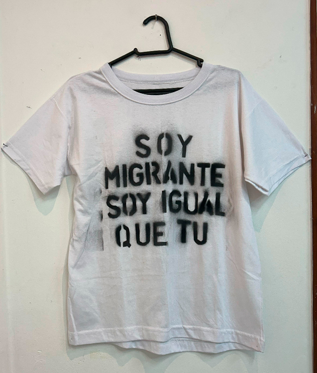 Las camisetas son lienzos urbanos, portavoces de un éxodo cotidiano. Las palabras no gritan; susurran verdades que el viento dispersa, verdades que piden ser leídas, entendidas, abrazadas. Porque migrar es existir, y existir es ser historia en tránsito.