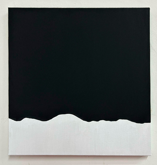 Línea de horizonte se presenta como un umbral donde la inmensidad del cielo y la solidez de la tierra se encuentran en tensión silenciosa. La frontera no es fija ni absoluta: la línea se ondula, respira, susurra la inestabilidad de los límites. El negro profundo, denso, parece contener el peso de lo desconocido, mientras que el blanco emerge con una pureza expectante, como si algo estuviera a punto de revelarse.