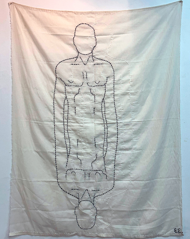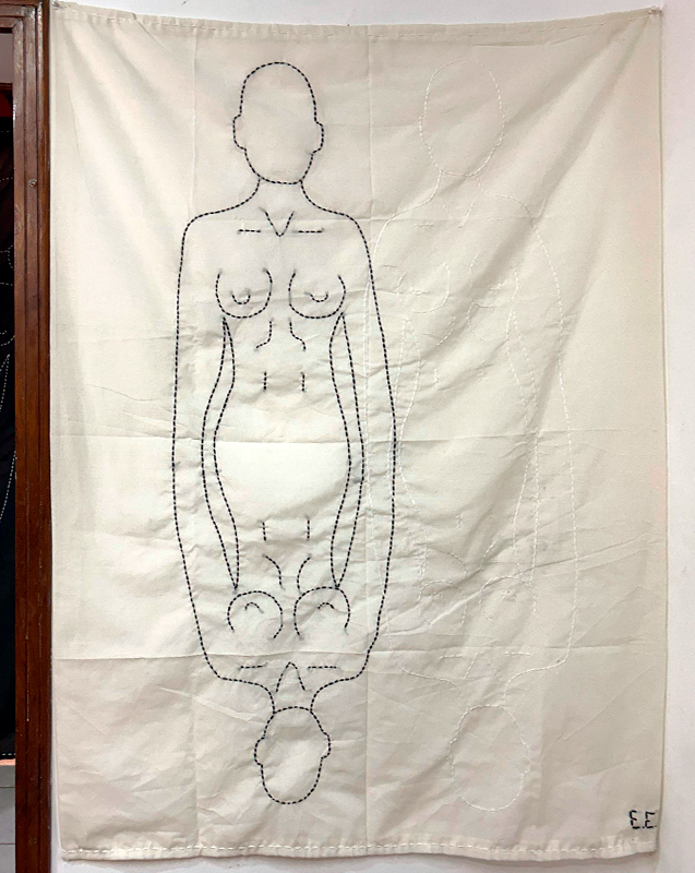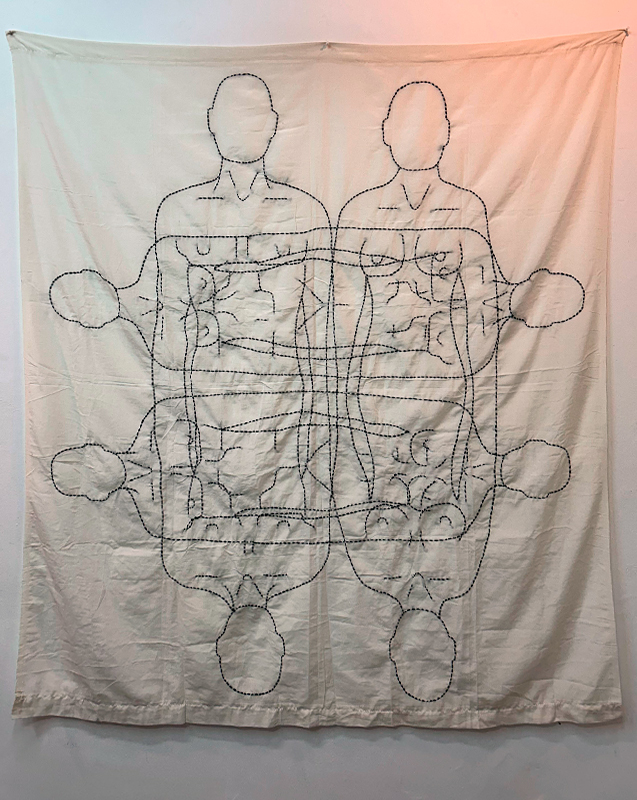 Las texturas del bordado evocan la piel, la historia inscrita en cada puntada, como si el cuerpo fuera un territorio tejido por experiencias. La elección del textil de Ao Poi como soporte refuerza la idea de fragilidad y resistencia, de lo humano como un entramado de fuerzas opuestas: lo efímero y lo persistente, lo íntimo y lo colectivo.