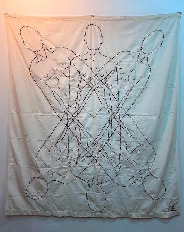 Bordado sobre el vacío, cuerpos que se repiten en la urdimbre del tiempo. El patrón repetitivo y entrelazado transforma la multiplicidad en unidad, un corpus donde cada figura es reflejo de la otra. La interconexión se vuelve inevitable, como si la materia que nos forma estuviera hilvanada con los mismos hilos invisibles.
