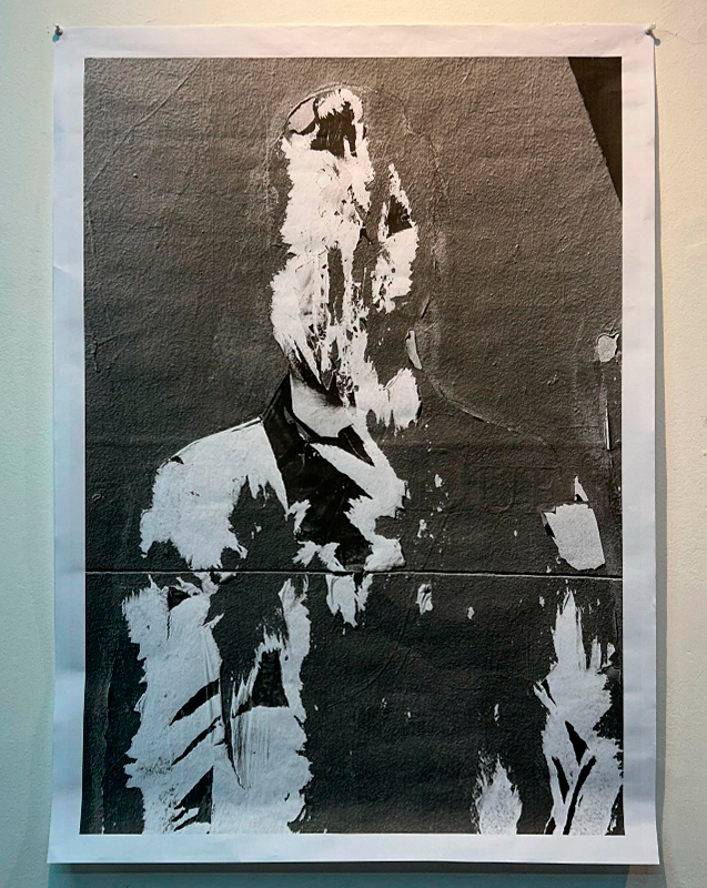 Espectros I, evoca la fragilidad de la memoria y la identidad. En ella, un cartel desgastado y parcialmente arrancado deja entrever la figura de un hombre. Su rostro, fragmentado por el paso del tiempo, parece resistirse a la desaparición, como un eco de lo que alguna vez fue.