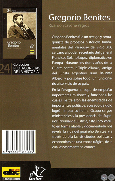 La Colección Protagonistas de la Historia, de la Editorial El Lector, presenta hoy, con el ejemplar del diario ABC Color, su volumen número 24: “Gregorio Benites: Un diplomático del viejo Paraguay”, del historiador compatriota Ricardo Scavone Yegros. Los ejemplares podrán adquirirse en todas las calles de nuestro país.
