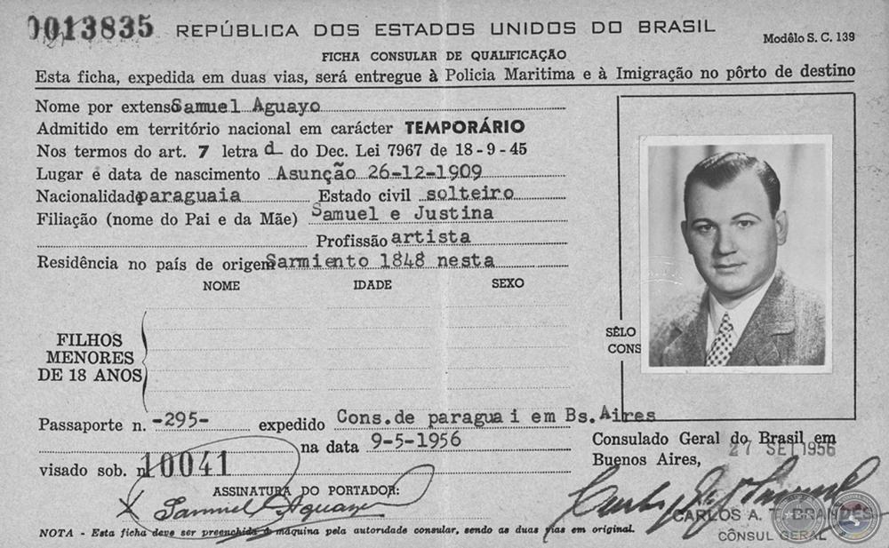 SAMUEL AGUAYO: Hijo de Samuel Aguayo Yegros y Justina Alonso, nació el 26 de octubre de 1909 en Villeta; descendiente por vía paterna de los Yegros, de rancio abolengo patricio, entroncado con civilizadores y próceres de la Patria. Llamado por una irresistible vocación, las canciones paraguayas ejercieron decisiva influencia, marcando la trayectoria de su vida. En sus inicios, apenas adolescente, gastó su tiempo y fue modelando su voz, en reuniones de amigos y fiestas pueblerinas. Y se lanzó a la aventura por el ferrocarril hasta Encarnación, y de allí a Posadas y otros pueblos, con su guitarra, sus canciones paraguayas y sus ansias de triunfo. En cada lugar, alguna actuación en cafés, veladas y otros espectáculos. Llegó a Rosario y pasó a Buenos Aires, meta anhelada de todos los artistas.