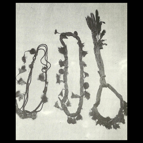 Las tobilleras de plumas de avestruz -a veces también brazaletes-, eran un adorno casi pautado en todas las danzas ceremoniales; se buscaba la "magia de engaño" para reafirmarse en su seguridad contra lo "imprevisto de la tierra"; el cañón de la pluma se partía por la mitad en el sentido longitudinal para sacar la parte blanda; era frecuente un teñido ornamental rosáceo.