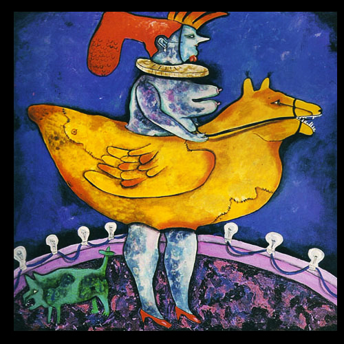 En los primeros dibujos expuestos en la Galería Tajy en 1966 ya se encuentra definida esa figuración híbrida que mezcla hombres, objetos y animales y combina lo jocoso y lo dramático en un enredo promiscuo e inquietante: sus gallinas-vasijas, sus aves con zapatos y anteojos, anuncian ese revoltijo de órdenes y de reinos naturales que se traspasará a épocas históricas, geográficas y diferentes niveles de realidad o de sueño.