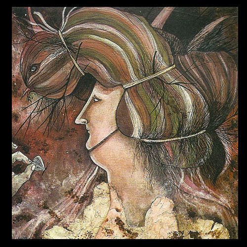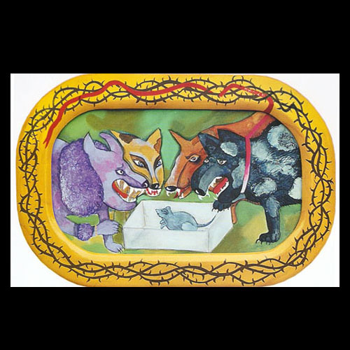 Ahora aparece la figura de un pez suspendida por una vara sobre un almohadón pintado con cabrilleos y reflejos acuáticos. La figura se encuentra tallada en madera, jaspeada como el almohadón y, tanto como las imágenes anteriores, oscurecida por una insolente profusión de pelos. Pero éstos ya no corresponden a suaves rincones humanos: son hirsutas crines animales que erizan la figura y la dotan de un aspecto agresivo. Exiliado de su medio, como tantos otros animales; como otros tantos seres vivientes, el pez se ha vuelto una presencia espuria, una criatura mestiza y distinta. Pero no ha olvidado el agua cuyo recuerdo espejea entre su pelambre impostada.