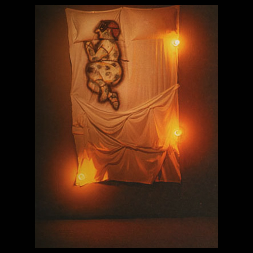 O la soñada: en la serie Los durmientes (1995), el albur ocurre en el fondo oscuro de la escena, en su detrás soterrado. Pintados sobre sábanas colgadas de las paredes o dispuestas horizontalmente sobre colchones inflables, rodeados de objetos, de fetiches, de signos de neón recuperados del otro lado de la conciencia, los personajes yacentes (soñadores o desvelados) se encuentran pendientes de sueños, fantasmas, pesadillas o deseos que no aparecen sino a través de pistas confusas, señales breves de un rumbo guardado por almohadas.