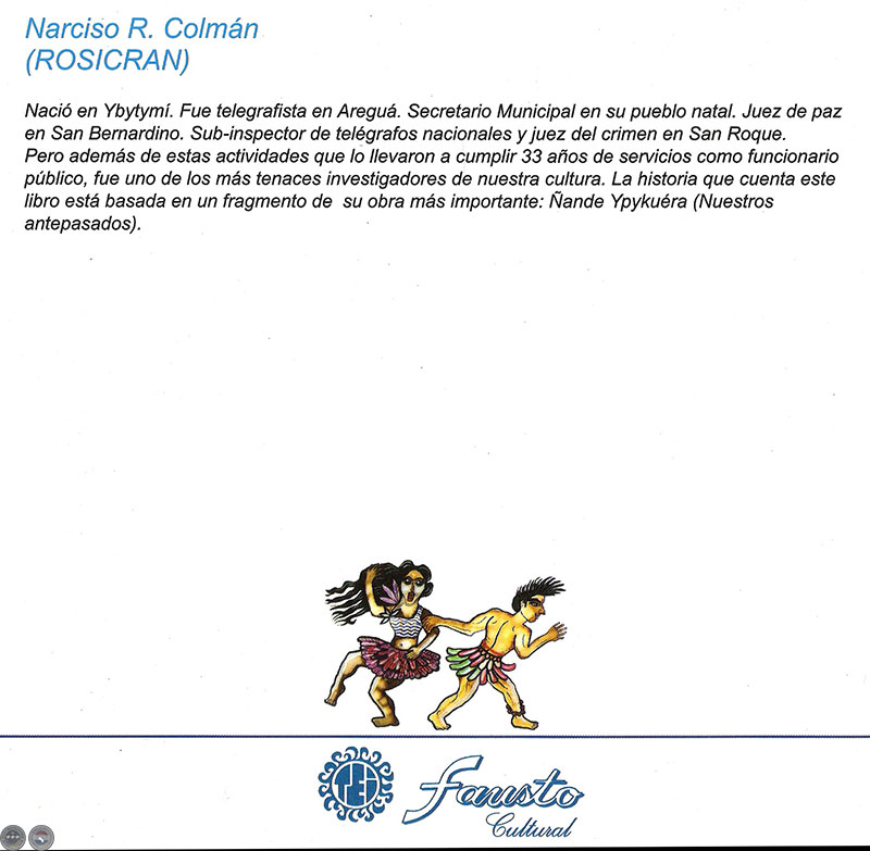Pero además de estas actividades que lo llevaron a cumplir 33 años de servicios como funcionario público, fue uno de los más tenaces investigadores de nuestra cultura. La historia que cuenta este libro está basada en un fragmento de su obra más importante: ÑANDE YPYKUÉRA (NUESTROS ANTEPASADOS).