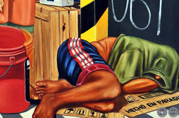 A los 12 años ya era medio independiente, cortaba el césped por Cerrito. Luego fue albañil, pintor de obras o de carteles para propaganda. “Vivíamos en casa ajena, gracias a Dios conseguimos de a poco un sitio propio”. Su realidad de pobreza le abrió los ojos para pintar un niño durmiendo en la vereda, sobre un cartón “de un producto que ‘tiene que estar a la sombra, es frágil, debe cuidarse, y es hecho en Paraguay. Es un simbolismo”.