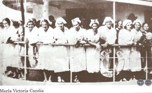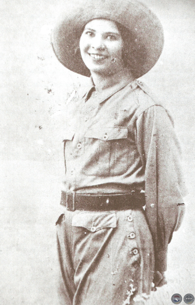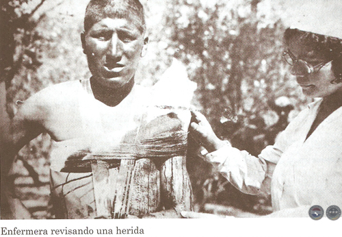 "La señorita Arminda Veia Franco de la Cruz Roja Paraguaya, fotografiada en Isla Poí momentos después del bombardeo por los aviones bolivianos. No teniendo donde refugiarse tuvo que quedarse sola con los heridos. En el fondo se ve un grupo de soldados que rodean el boquete que ha producido una de las bombas al estallar”