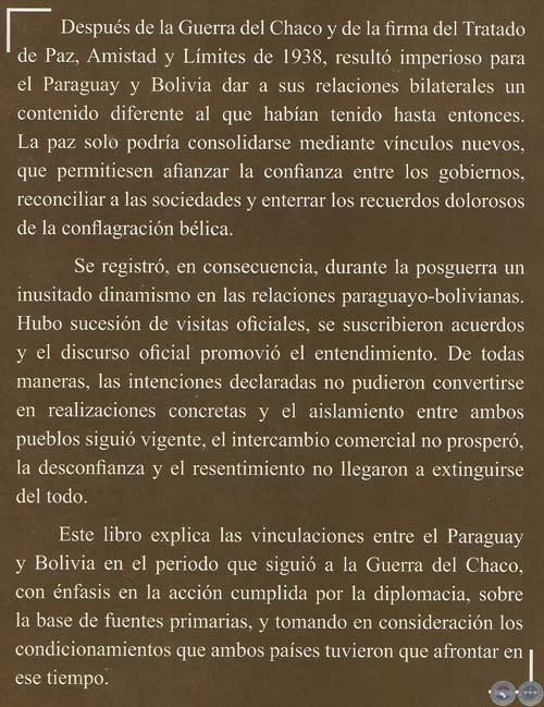 Se presenta aquí el resultado de una investigación histórica acerca de la vinculación paraguayo-boliviana en el periodo que siguió a la Guerra del Chaco, centrada, sobre todo, en la acción cumplida por la diplomacia. Para su elaboración se ha recurrido fundamentalmente a los informes y documentos producidos por las cancillerías y las representaciones diplomáticas de los dos países en esos años, que se conservan en los archivos históricos de los respectivos Ministerios de Relaciones Exteriores.