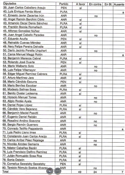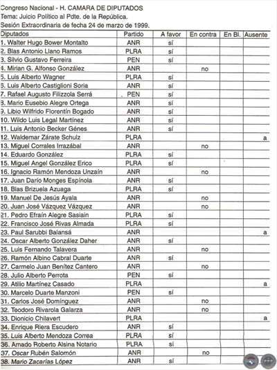 Votos en la Cámara de Diputados el día 24 de marzo de 1999 en ocasión del tratamiento de la acusación para el «juicio político» al entonces Pdte. De la Rca. Ing. Raúl Cubas Grau.