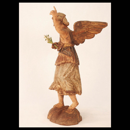 Talla jesuítica, s. XVIII, imagen del Arcángel San Gabriel, representado con cabellos dorados, alado, descalzo, sosteniendo un ramo florido en la mano derecha y señalando el cielo con la izquierda, según la iconografía que lo caracteriza. La túnica y la sobretúnica que lo visten dejan medio pecho suyo al descubierto. Los brazos han sido restaurados casi totalmente.