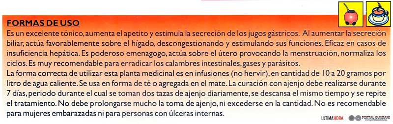 Tiene una sustancia amarga, digestiva y tónica, motivo por el cual varios medicamentos químicos son producidos a partir de la propiedad del ajenjo. También tiene propiedades vermífugas, o sea, es bueno para combatir las lombrices intestinales (sevoʼi kuéra), como así la fiebre. De esta útil y curativa planta se hace un aceite ideal para combatir la flatulencia (gases intestinales).