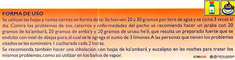 La medicina tradicional paraguaya viene utilizando esta especie con resultados muy positivos para todo tipo de problemas del sistema respiratorio y para los bronquios. Se acostumbra potenciar sus principios curativos con las propiedades del ambaʼy, urusu heʼê y el jaguarundi.