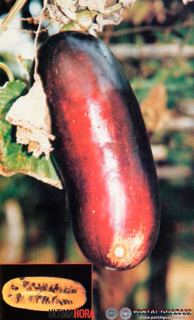 El fruto grande y carnoso de esta planta es muy parecido a una enorme berenjena y puede alcanzar entre 30 a 60 cm de largo. Tiene un sabor fuerte y los aromas que despide son dulces, agradables, similares al melón mezclado con el aroma de duraznos. La pulpa tiene un corazón carnoso de color amarillo-anaranjado.