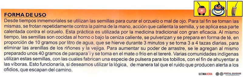 Estas semillas son las que la medicina tradicional paraguaya utiliza con gran eficacia para eliminar arenillas y piedrecillas de los riñones y vejiga.