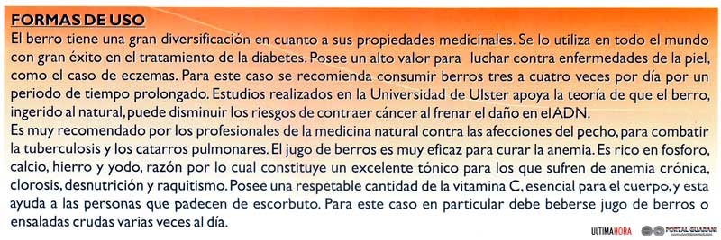 Lo que conocemos popularmente como berro no es una sola planta, sino varias que pertenecen a diversa especies, pero que tienen en común el suave saber amargo y algo picante. Contiene aceites etéreos de mostaza, lo que la brinda el sabor único y peculiar. Se deben lavar muy bien las hojas por que tienden a tener huevos de parásitos.