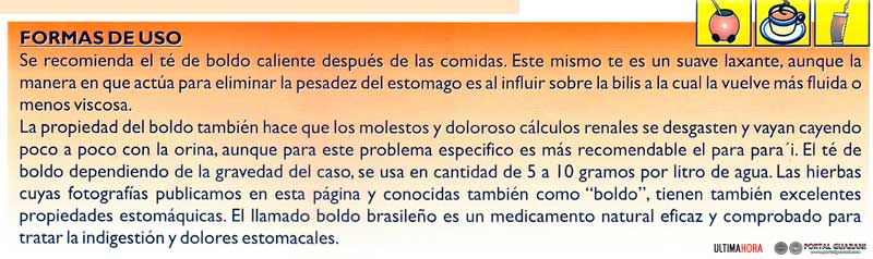 En Paraguay y el Mercosur se acostumbra a tomar un buen te de boldo después de una comida pesada y esto hace que la digestión mejore rápidamente. Las hojas del Peumus boldo, se consiguen con facilidad en nuestro país.
