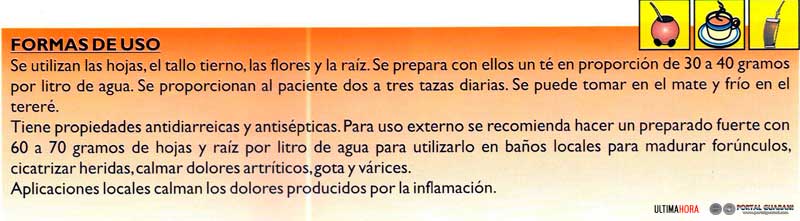 Al mismo tiempo se debe suministrar por vía oral un té fuerte de la misma planta con el objetivo de neutralizar el veneno inyectado por los ofidios. Tiene propiedades reconocidas como antiséptico, astringente y emoliente (madura los forúnculos).