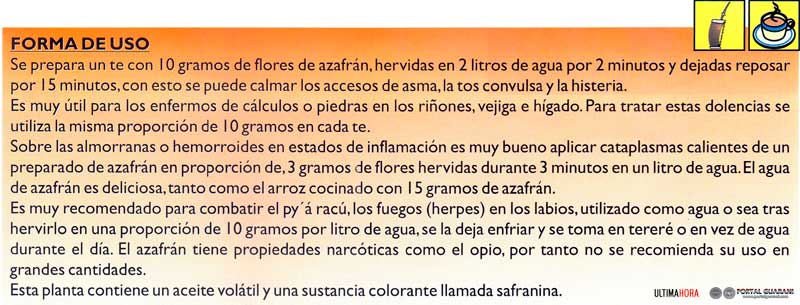 El azafrán (Crocus sativus) es una planta medicinal con excelentes propiedades para combatir la tos convulsa y los ataques de asma. En Paraguay tenemos el Arazo, una variedad particular de azafrán adecuada a nuestro clima.