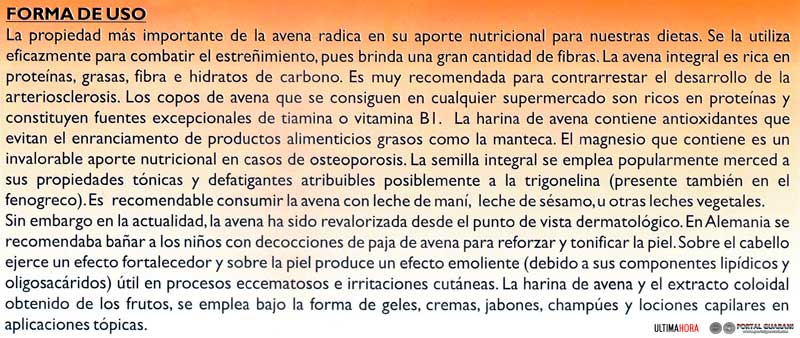 Entre los principales componentes ubicados en la semilla se encuentra la gramina, un alcaloide indólico que también se haya presente en el centeno, la cual ha demostrado poseer propiedades sedantes a través de sus extractos alcohólicos. La planta verde sirve a menudo para elaborar henos, ensilados y como pasto, y la paja constituye una excelente cama para el ganado. La avena es también valiosa en la practicas de rotación de cultivos en suelos agrícolas y ganaderos. La variedad más cultivada es la avena común. Según la historia, las variedades cultivadas proceden de la avena silvestre, que sembraban hace unos 4.500 años los campesinos de Europa y Oriente Próximo.