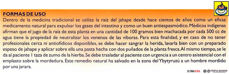 La raíz del jahape es aromática y tiene muy buenas propiedades medicinales. Los médicos naturalistas de los departamentos de Guairá y Caaguazú afirman que tiene el poder de neutralizar el veneno de las víboras.