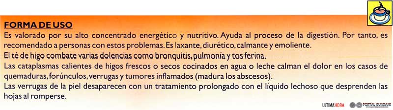 Esta planta pertenece al género de la familia de las moráceas, que producen frutos jugosos y deliciosos llamados higos. La higuera común, nativa de Oriente Próximo, se cultiva mucho en países tropicales y subtropicales. Es un arbusto o pequeño árbol, caducifolio,que llega a 5 metros de altura, con excelentes propiedades nutricionales y medicinales. Por eso, insistimos en varias publicaciones que sea consumido especialmente por niños y adultos, quienes necesitan mayor cantidad de nutrientes energéticos.