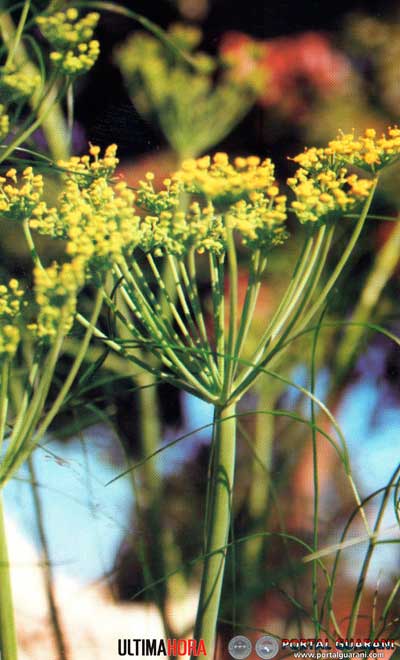 El hinojo (Foeniculum vulgare, M.) es una hierba perenne aromática que llega a unos 2 metros de altura y pertenece a la familia de las umbelíferas. Tiene el tallo erecto, hojas compuestas grisáceas y flores que forman umbelas con mucha cantidad de florecillas amarillas.