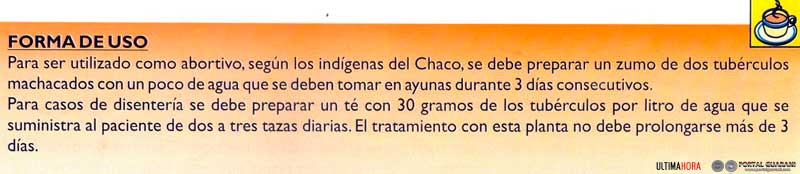 En Paraguay tiene muy pocos estudios, pero es usada por la medicina ancestral e indígena en casos de colitis, disentería y como un poderoso abortivo.