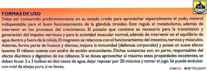 De su contenido vitamínico destacan la vitamina C y los folatos. La vitamina C tiene acción antioxidante, interviene en la formación del colágeno, huesos, dientes y glóbulos rojos, y favorece la absorción del hierro de los alimentos y la resistencia a las infecciones. Los folatos colaboran en la producción de glóbulos rojos y blancos, en la síntesis de material genético y la formación de anticuerpos del sistema inmunológico. El principal aporte del rábano para la salud y la belleza se concentra en sus componentes antioxidantes, su abundante vitamina C y los minerales en gran cantidad que contiene como potasio y el yodo, más que en otras especies vegetales. También contiene magnesio y calcio.