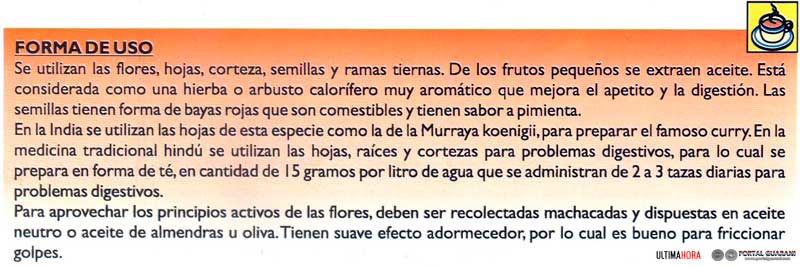La Murraya koenigii tiene hojas comestibles. Es un arbusto de mediana altura que florece en forma explosiva (casi de una vez), llenando de aromas intensos los jardines y según las creencias hindúes siempre anuncia una buena lluvia, caso que lo hemos comprobado varias veces.