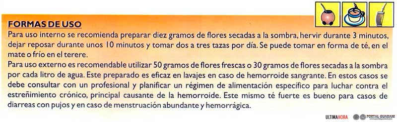 En la medicina tradicional paraguaya se utiliza esta hermosa hierba desde tiempos muy antiguos como un gran desinflamante natural. Tiene propiedades calmantes al igual que el Salix alba o aspirina natural.