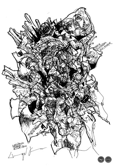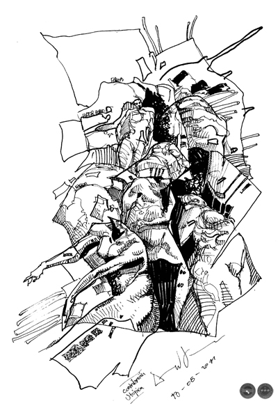 Los mundos no delineados claramente o, si se quiere, los momentos en el mundo en que se ha acabado una época y lo que era ya no es, son, en principio, confusos. Está lo viejo sosteniéndose sin demasiada convicción, junto a diversas manifestaciones de algo que, sin proponérselo, resultan en algo nuevo. A la vez hay tantas otras expresiones, con distintos significados y lazos con el presente y el pasado, que se prometen ser lo nuevo. Angel Jara recurre a un dibujo que se relaciona con formas prestigiadas del arte, pero también y muy explícitamente a formas de la historieta que lo acercan productivamente a zonas del rock y fanzines suburbanos. Y allí están, de algún modo u otro, los viejos cómics darks, la revista Fierro y Simón Bisley. En los cómics de los fanzines barriales, tanto como algunos del mundo prestigiado de la historieta, aparecían mundos oscuros y violentos, o bien podían transformarse en parodias exacerbadas como en la historieta argentina El Cazador. El mundo de los dibujos de Jara tiene restos de esa violencia oscura y de alguna grandiosidad figurativa que era parte de esas experiencias, pero en medio de esas brumosas imágenes suburbanas, traza gestos que son el intento por pelear por construir algún sueño. Una voluntad hipercondicionada, que no porta banderas, que no puede adivinar alboradas prefiguradas por programas ideológicos, pero que sin embargo está. Hay, aunque sea en potencialidad, elementos de sueños utópicos en eso que es una rebeldía primitiva. A diferencia del camino definido a la utopía prefigurada, este es un balbuceo, en que lo que hay es la voluntad de negar parcialmente lo que oprime. Y en esa negación esta el sueño, la contribución a la utopía.