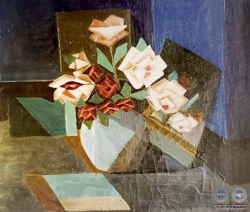 El mundo racional de Olga Blinder nos lleva al legendario cubismo que fuera tocado de forma urgente en el arte paraguayo de principios de los años 50 tratando de quemar etapas perdidas de la pintura internacional en el arte paraguayo, que nos enseña en esta composición de 1953 que presentamos en este tiempo de rosas. Por su lado, Leonor Cecotto, vecina del barrio La Encarnación, cortaba metros de telas estampadas para confeccionar vestidos de sus más encumbradas vecinas de aquellas décadas mientras pintaba sus grandes “flores pop” inspirada en coloridos tejidos que lucían los viejos maniquíes del taller de costura de su casa de la calle O’Leary y Jejuí.