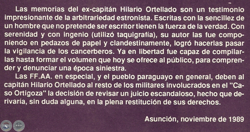 De cualquier manera, estas memorias del capitán Hilarlo Ortellado, residente en el Uruguay desde 1970, son un testimonio impresionante de la arbitrariedad estronista. Escritas con la sencillez de un hombre que no pretende ser escritor, tienen la fuerza de la verdad. Con serenidad y con ingenio, su autor las fue componiendo en pedazos de papel; y clandestinamente, logró hacerlas pasar la vigilancia de los carceleros; fue capaz de compilarlas hasta formar el volumen que hoy se ofrece al público, para comprender y para denunciar una época siniestra.