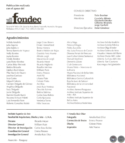 Mi infinito agradecimiento al FONDEC, entidad que convierte en realidad mis proyectos; al Instituto Superior de Arte ISA de la Facultad de Arquitectura de la Universidad Nacional de Asunción, institución que fortalece mi pasión investigativa; a los grandes coleccionistas por la generosidad de compartir su patrimonio; a las profesoras Nélida Amábile y Verónica Verón por compartir su selecto archivo; a los historiadores, profesores, artistas, periodistas, alumnos y a todos quienes contribuyeron a ampliar las páginas de esta edición.