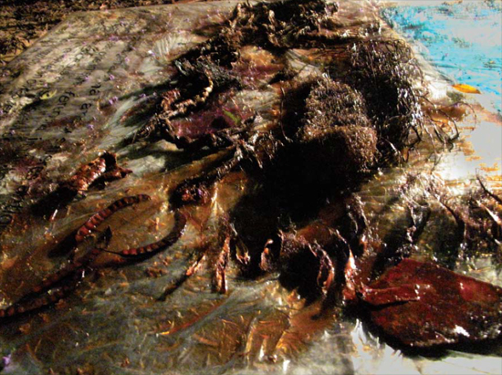 En efecto, Yegros presenta su LIBRO DE ARTISTA como un autorretrato que se despliega en muros-pizarra obtenidos a partir de relieve y pintura, entramados, transparencias y opacidades logradas con el uso de resinas especiales, grafías, íconos referenciales, elementos vegetales.