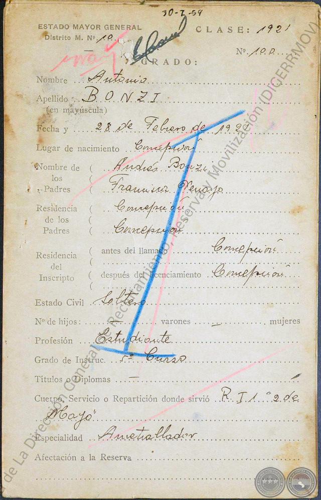Bonzi fue detenido por primera vez en 1943 por tenencia de “material comunista” y posteriormente confinado a Concepción por tres meses. Este primer antecedente le provocó la pérdida de su puesto laboral. Luego de unos meses en los que fue sostenido económicamente por su padre, consiguió otro puesto en la Dirección de Trabajo. Nuevamente fue despedido a los dos meses por sus antecedentes políticos. Finalmente, logró ingresar a la Defensoría de Menores como secretario (1944) y luego fue Procurador de Pobres y Ausentes (1945-46).