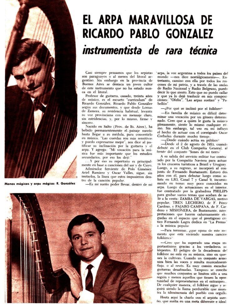 En la Revista Nº 117 (5/4/1966), se publica una primera entrevista donde cuenta entre otros temas, de sus inicios en 1953, de su admiración por Polo Giménez y Oscar Valles y la música sureña y cuyana, o de sus obras “Ofelia”, “Las arpas sueñan” y “Pabellón”.