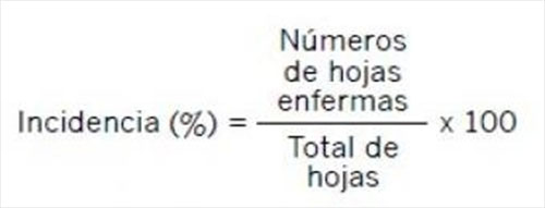 Para el productor o técnico asesor, la incidencia de la enfermedad es más fácil de cuantificar como la incidencia de hojas con síntomas (porcentaje de hojas con al menos una pústula de roya o síntomas de por lo menos una mancha de más de 2 mm) colectados en zig-zag de al menos 40 macollos al azar por lote calculando la incidencia en la siguiente fórmula.