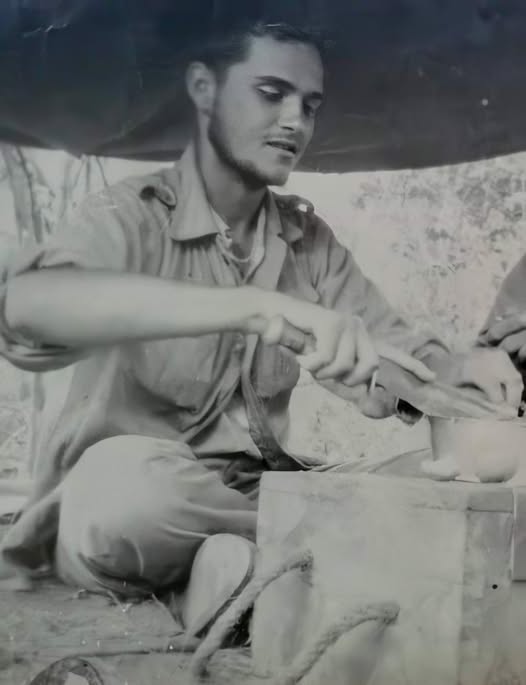 Durante una pausa almuerza Ramiro Rodríguez Alcalá, utilizando como mesa improvisada, un cajón vacío de municiones "Sureté".