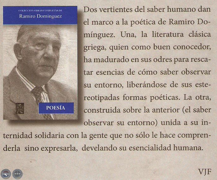 Dos vertientes del saber humano dan el marco a la poética de Ramiro Domínguez. Una, la literatura clásica griega, quien como buen conocedor, ha madurado en sus odres para rescatar esencias de cómo saber observar su entorno, liberándose de sus estereotipadas formas poéticas. La otra, construida sobre la anterior (el saber observar su entorno) unida a su internidad solidaria con la gente que no sólo le hace comprenderla sino expresarla, develando su esencialidad humana.